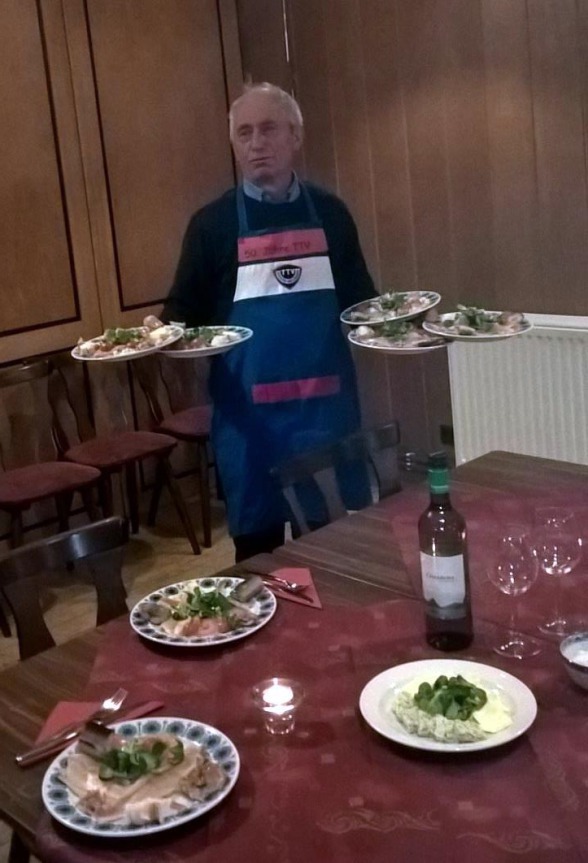 Wie aus unseren regelmäßigen Berichten sicherlich bereits die Erkenntnis gewonnen werden konnte, dass der TTV Stirpe Oelingen neben dem Tischtennis Sport auch in anderen Kategorien nach den Sternen greift, wollen wir diese These im aktuellen Bericht über unser Vereinsleben untermauern. So lud der TTV unter der Regie von Fischobermeister Lothar Kalkbrenner, unser Bild verleiht seinem Glanz nochmals Ausdruck, am 2 Februar in die Gemeinschaftshalle in Stirpe Oelingen zum traditionellen Fischessen ein. Aus eigener Zucht konnte Lothar den Gästen geräucherte Forelle anbieten, des Weiteren wurden aus der Nordhausener Mühle weitere Delikatessen zur Verfügung gestellt. So landeten neben Lothars Forelle auch noch geräucherter Aal, Lachs, Heilbutt, Krabben und Pfeffermakrelen auf dem schön angerrichteten Tellern. Dazu wurde ganz traditionell Butter und Brot serviert, aber auch Saucen. So wurde dieser Abend zum kulinarischen Highlight an dem die Gäste satt und zufrieden nach Hause gehen konnten. Viele Dank an Lothar und Angela Kalkbrenner und Festausschussvorsteher Jörg Hüsemann.