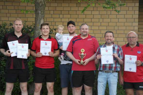 v.l.n.r. Mike Hugo, Frederic Böss (Vereinsvorsitzender und 2.Sieger), Patrick Hugo mit Töchterchen, Vereinsmeister André Beckmann, Frank Kolchmeyer und Martin Rahe